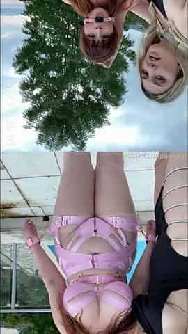 Blonde teen lesbians toying outdoors