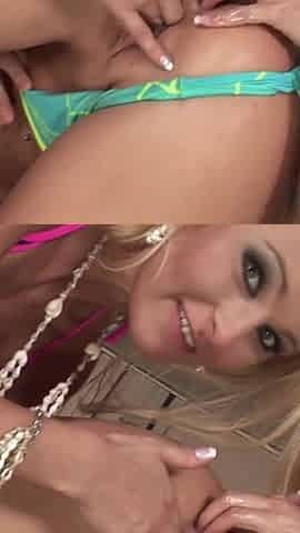 Blonde lez babes toying asses and fingering pussies in threesome