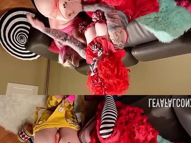 Maya Sinstress And Leya Falcon In Babe Rides Sexy Clown Big Dildo!