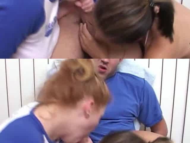 To help make up for injuring him the sporty girls give him a double blowjob