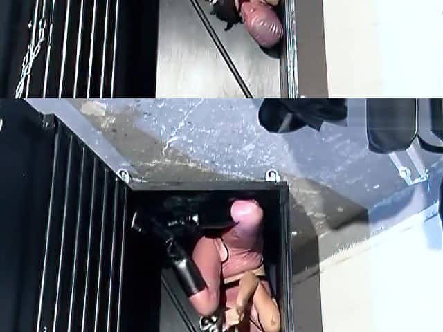 Gimp girl locked in box and pillory