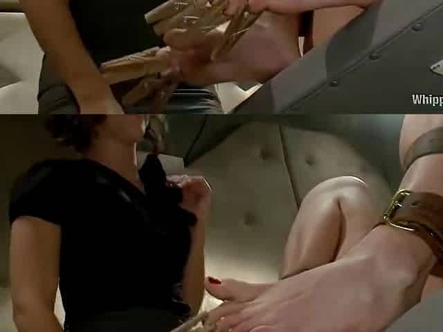 Lesdom Fun For Horny Blonde Dom Flogging Sexy Brunette Submissive Beauty With Dildo Whip