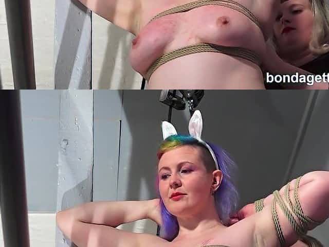 Busty lesbian slave hung for thighs