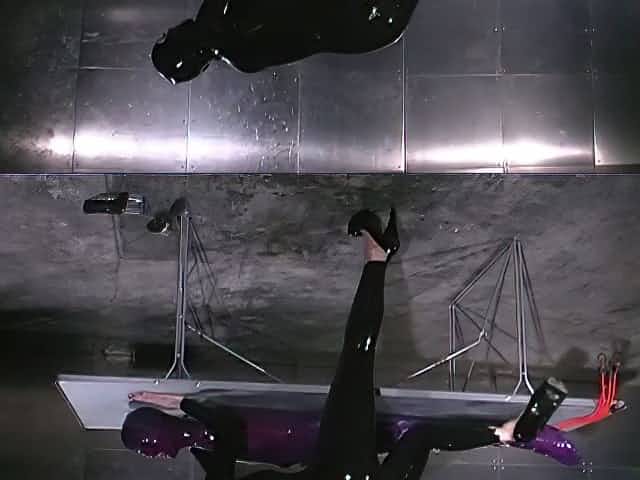 Submissive tied up chick in latex stuff gets slapped by horny domme