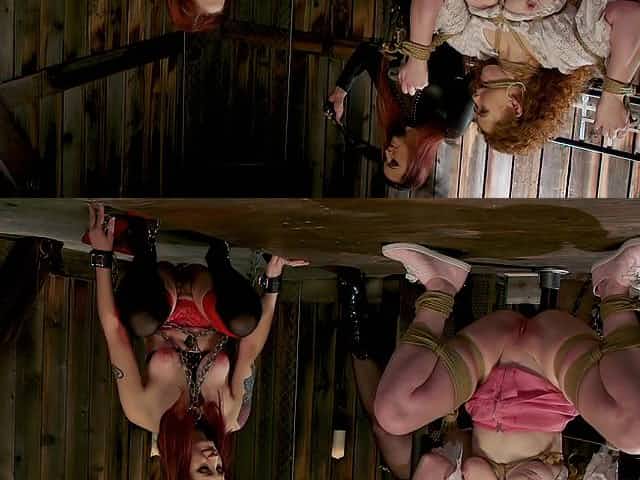 Kinky tied up lesbian strap on threesome with Bella Rossi at a barn