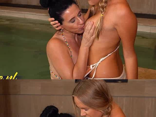 Blonde Babe Nina Heels Eats Out a Hairy Mature Pussy At The Swimming Pool