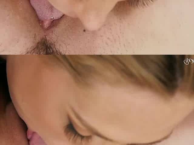 Pale blonde and tanned brunette lesbians toying and licking