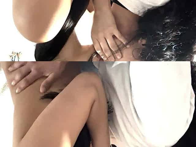 Tiny hairy lesbians finger wet pussy outdoors after kissing