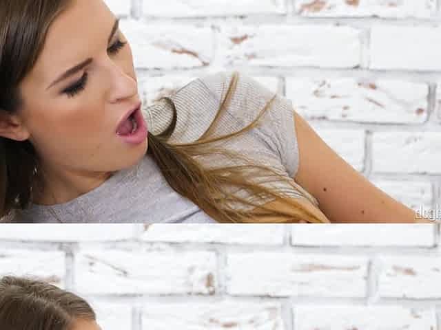 Brunette stepsisters fuck on the couch