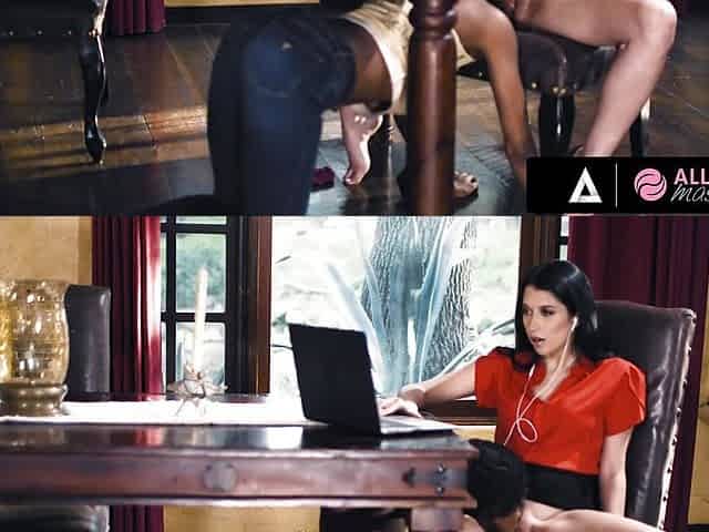 "ALL GIRL MASSAGE - Sexy Ebony Pleasures Her Busy Wife Under Table Before Licking Her Pussy"