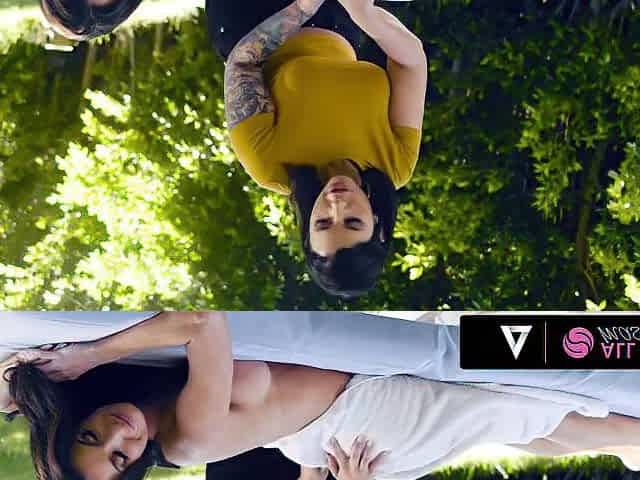 Girlsway - small Vanna Bardot's pussy gets lubricated up outside by hot resort masseur jasmine sherni