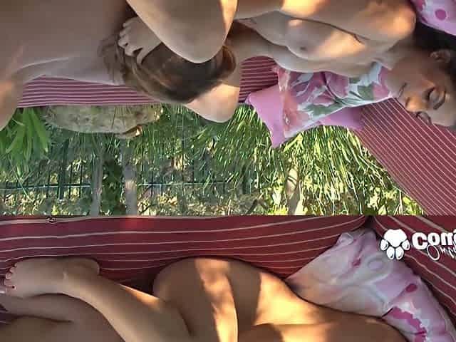 Mature brunette lesbian licks a pussy outdoors