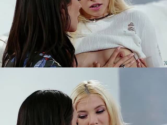 Brunette teeny seduces a busty blonde mom for some hot lesbian fucking