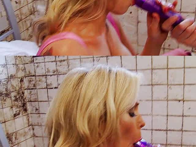 Two hot busty young women with blonde hair licking and dildoing each other's pussy.