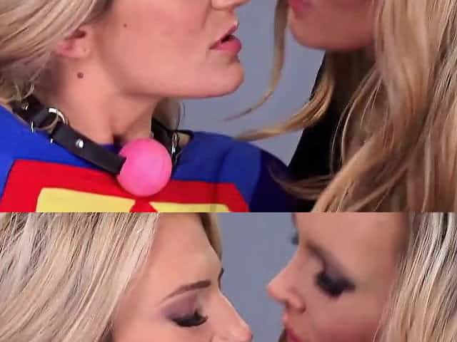 Lesbo golden-haired with legs over head