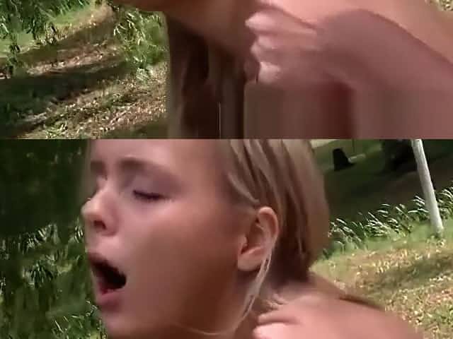 Old mother toying her young pussy outdoors