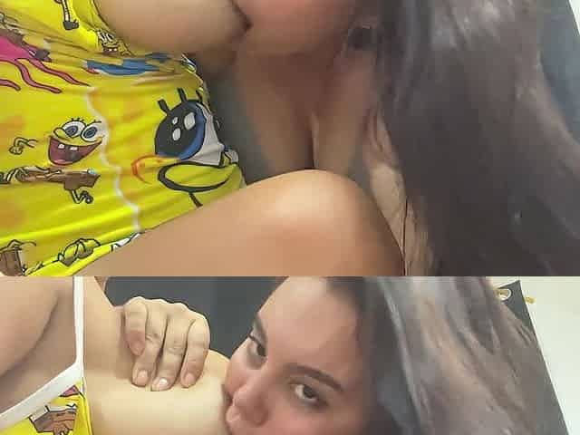 Two busty girls playing with their milk-filled breasts