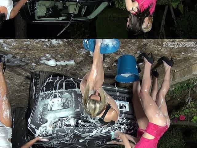 Busty blonde gets special lesbian treatment from three car washing girls
