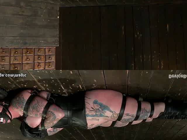Tattooed lesbian strapped in leather