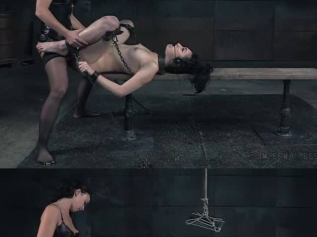 Cute young lesbian brunette in a corset is tortured by her slave mistress