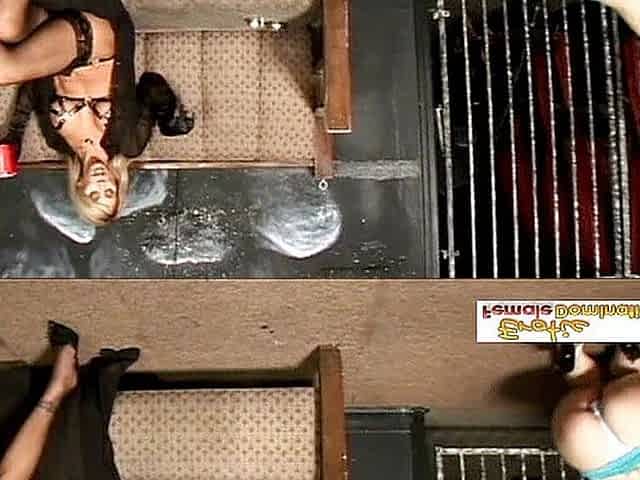Sweaty booty blond slave gets pussy fucked with a dildo by horny bitch