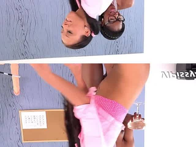 Pretty ebony babe gets her pussy banged with a big strapon by her horny girlfriend