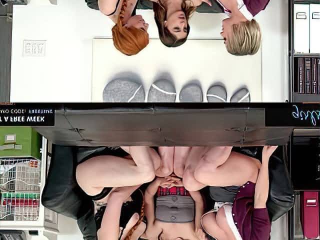 Two naughty schoolgirls indulge in a wild lesbian threesome with their voluptuous mature teachers Aurora Sky and Kira Stone