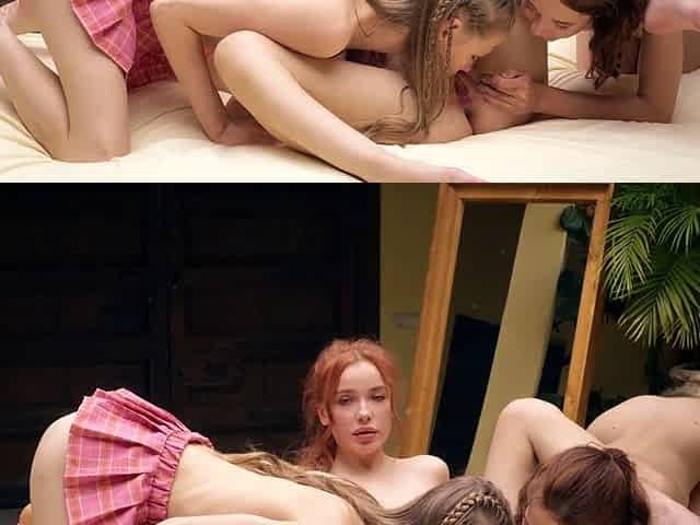 Lesbo three-some kiss and lick their moist vaginas reaching climax