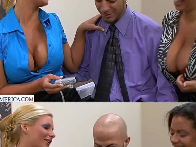 Sexy co-workers Phoenix Marie and Alexis Silver share some dick at the office
