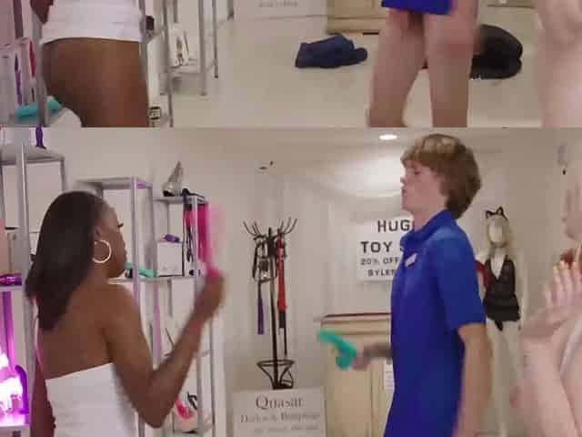 Sexy Fit Ebony MILF & Her Curvy Busty Blonde GF Entice a Young Sex-shop Consultant Into Crazy 3-some