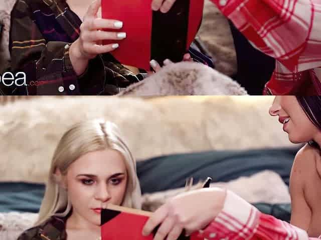 Blonde and brunette lesbian girls licking and toying