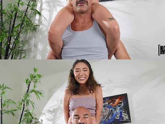 Hot 18-year-old blonde Irina Cage teases her 40-year-old DILF Renato with lingerie before getting her pussy wrecked