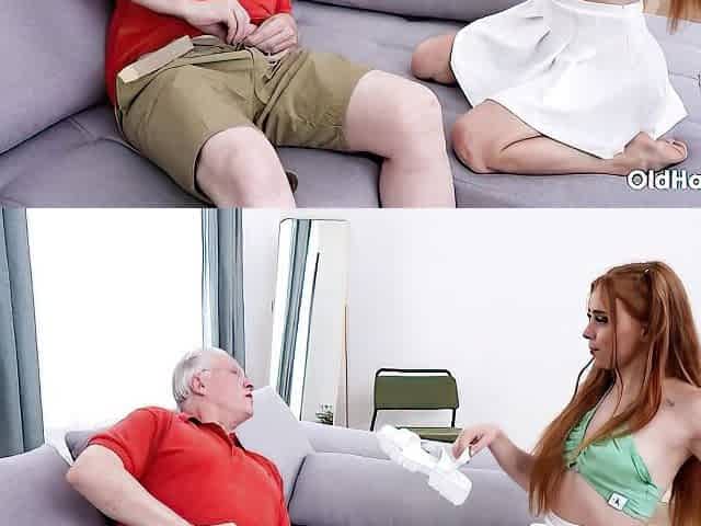 Blonde girlfriend Marilyn Sugar gives a good blowjob for an old man