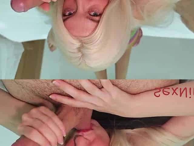 Amateur blonde in glasses gives a dirty blowjob and nylon footjob