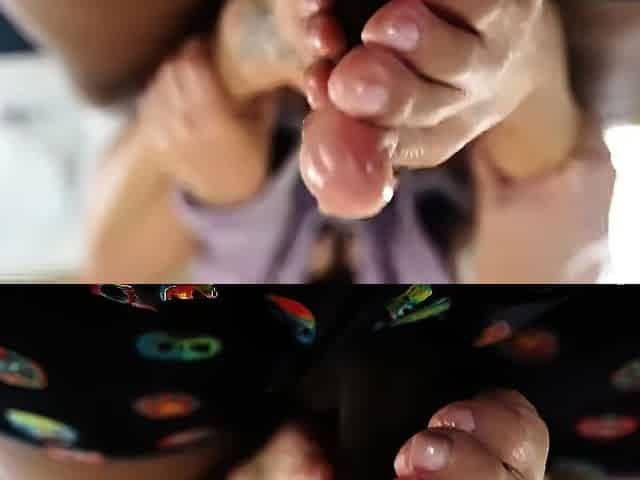 Handjob amateur MILF in lingerie cumshot after tugging cock