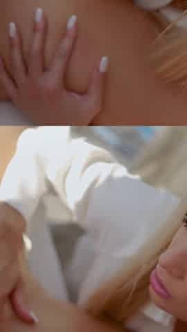 Non stop blonde with big boobs cock jerks off on the bed