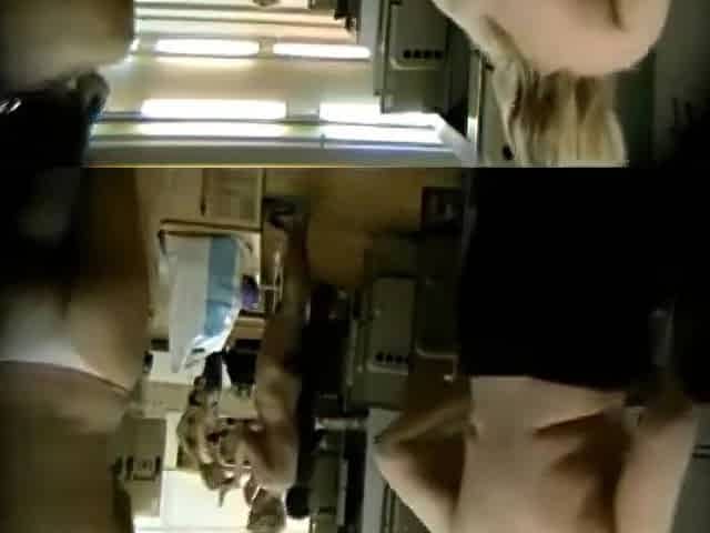 Lesbian threesome in the locker room, girl gets dped by strapon