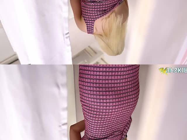 Leggy blond chick in short tight dress Lola is flashing pink panties