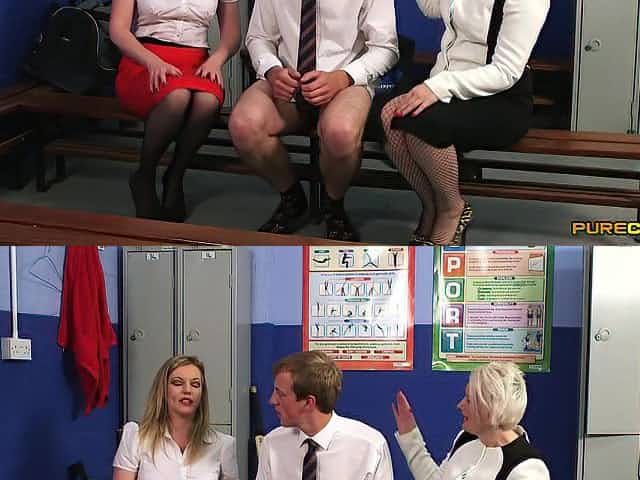 Two geeks fuck sexy PE teacher in anus and pussy in the locker room