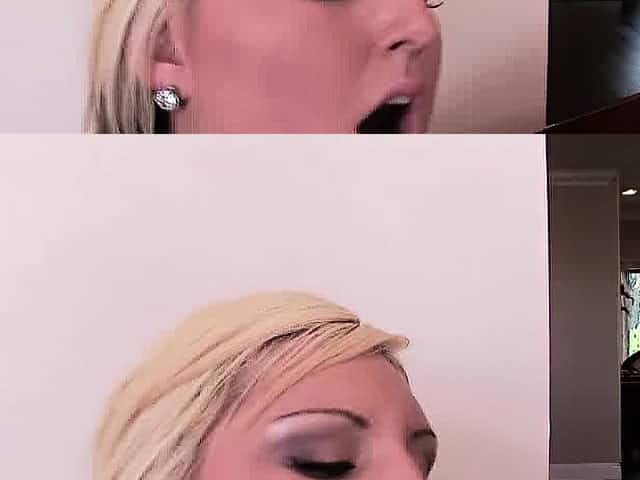 Mandy Sweet, a busty blonde with a superb ass, takes a long cock deep in her twat