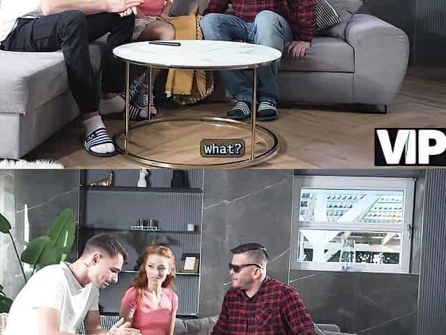 Beautiful blonde Ivy Maddox gives a blowjob to two men at once.