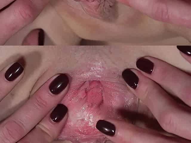 Gorgeous soloing brunette plays with her wet shaved pussy