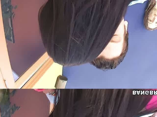 Skinny and young brunette Bianca Bangs impaled by massive cock