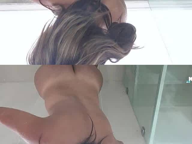 Hung Golden-haired breasty and charming Naomi Chi enjoys the shower and soap on her large melons and shlong