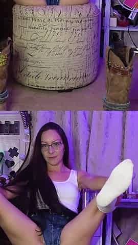Brunette hair shows off her splits bare & in tall leather boots(heels)