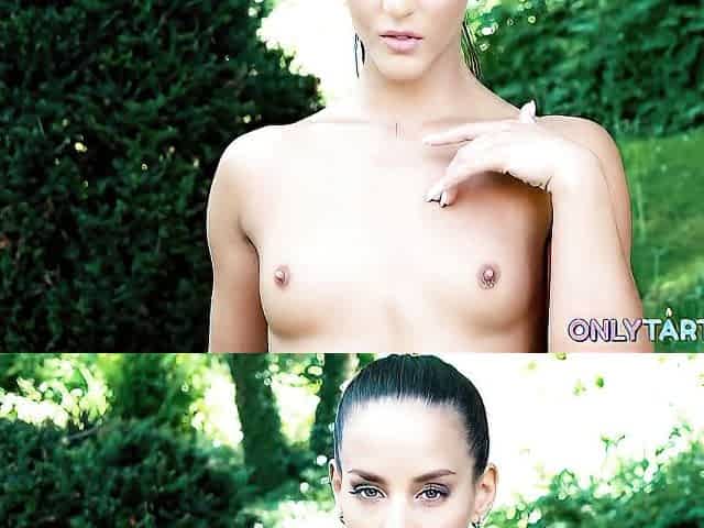 Alluring brunette Betzz is touching her pussy on the green grass