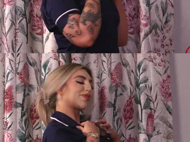 Tattooed MILF Kristy Brammeld does a striptease for a naked guy