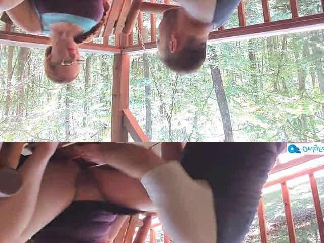 Ginger MILF with long braided hair gives an outdoor blowjob and enjoys some pussy licking on the porch swing