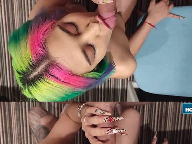 Cuckold babe gives handjob with long nails while getting covered in cum