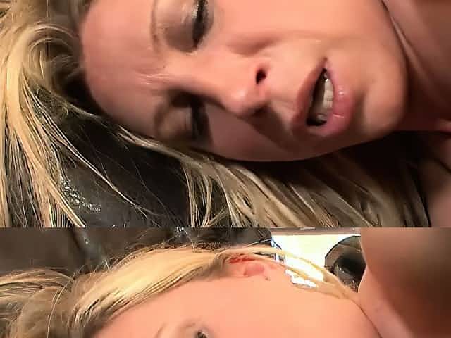 Blonde bimbo puts her lusty lips around this lucky dude's boner